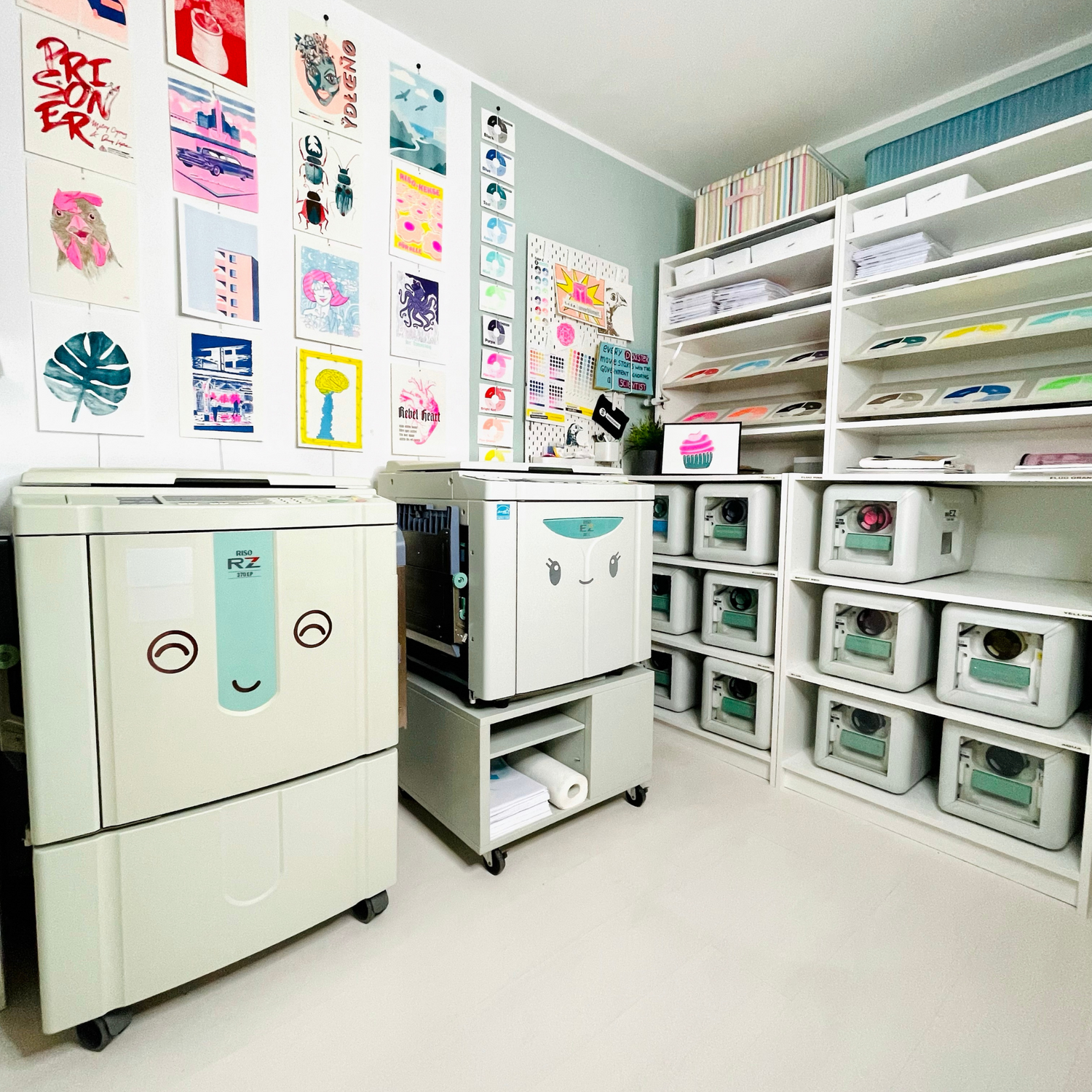 Hier drucke ich mit zwei Risographen und aktuell mit 23 der schönen Riso-Farben.